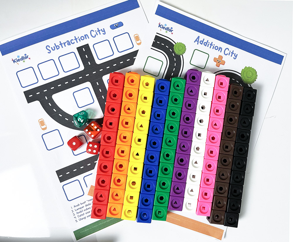 Moms bisa langsung download free printablesnya. Cukup print, siapkan MathLink Cubes + dadu, dan biarkan si kecil membangun kotanya sendiri.