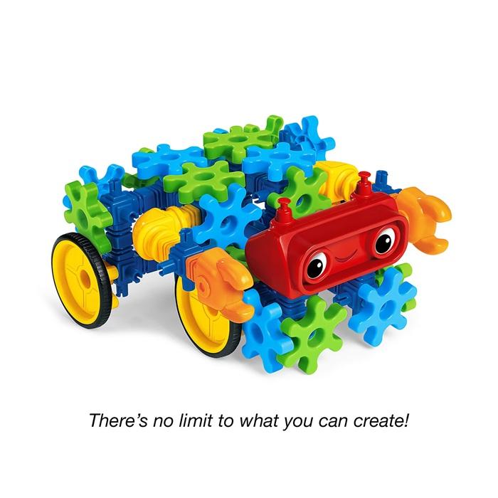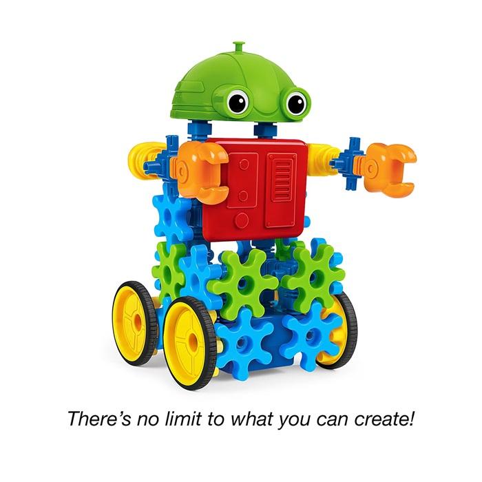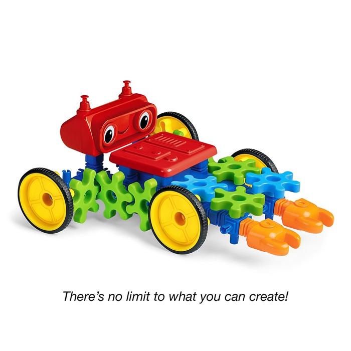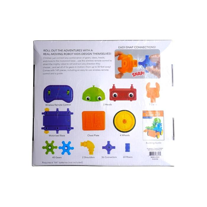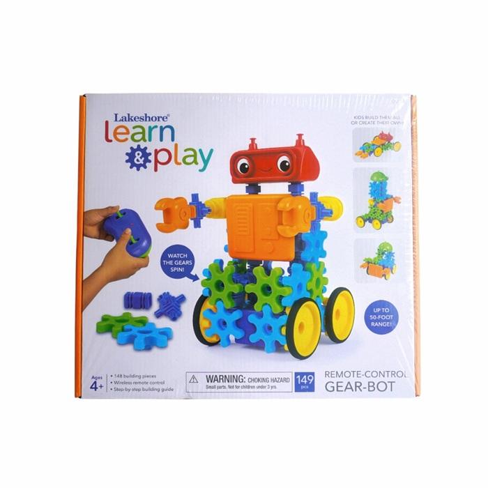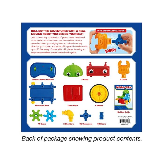 Roll out the adventures with a real, moving robot you design yourself! Lakeshore Remote-Control Gear-Bot lets kids connect gears, claws, heads, and more to a motorized base—then use a wireless remote to drive and turn their robot in any direction.