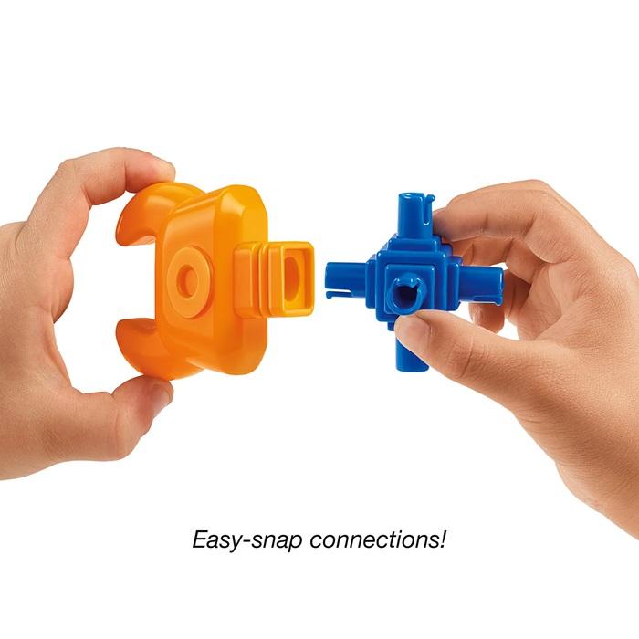 Anak dapat menggabungkan gear, capit, kepala robot, dan berbagai komponen lainnya ke dalam basis bermotor, lalu menggunakan remote control nirkabel untuk mengarahkan robot bergerak ke segala arah—bahkan dari jarak hingga 50 kaki (~15 meter).