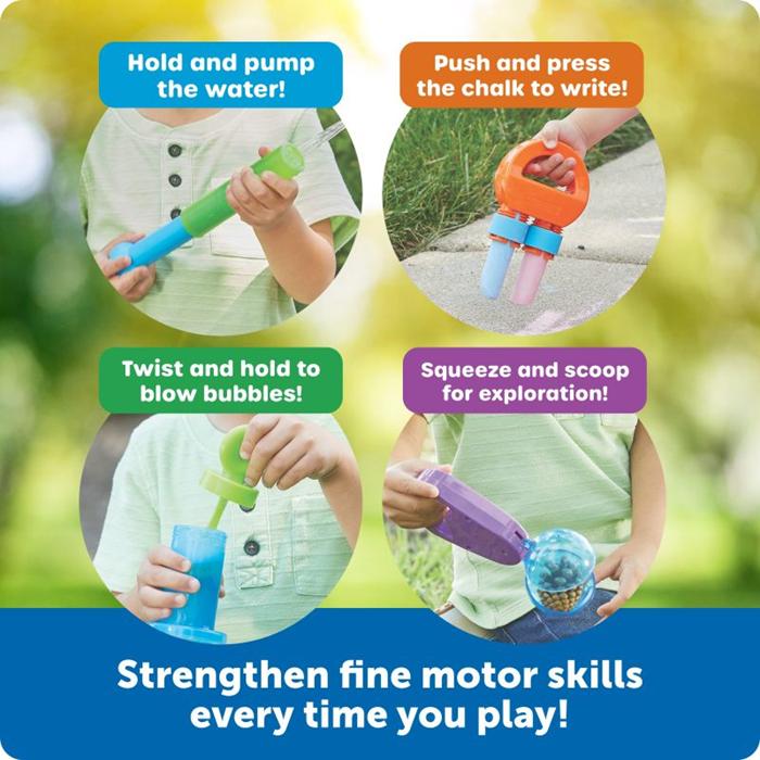 Each tool develops a different fine motor skill—twisting, squeezing, pulling, and more! Made from durable, easy-to-clean materials, these tools are perfect for outdoor sensory and tactile play.