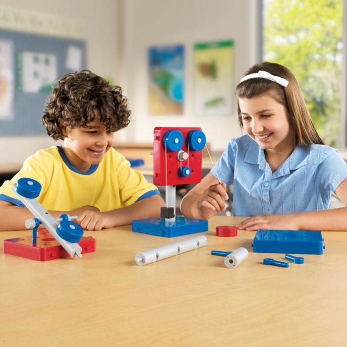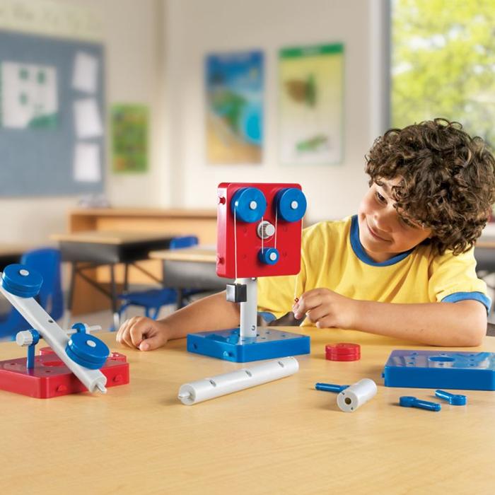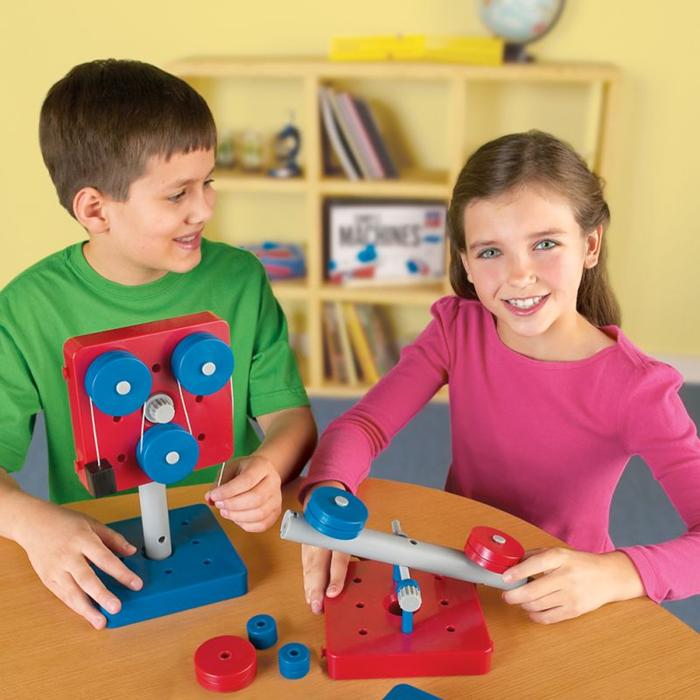 This comprehensive STEM set lets kids construct 5 simple machines at once — lever, pulley, inclined plane, wheel & axle, and wedge — to discover how force, effort, load, motion, and distance work together.