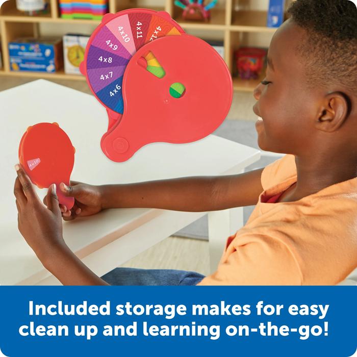 Choose the multiplication table you want to practice from the included circular cards, insert it into the wheel, and spin to reveal an equation.